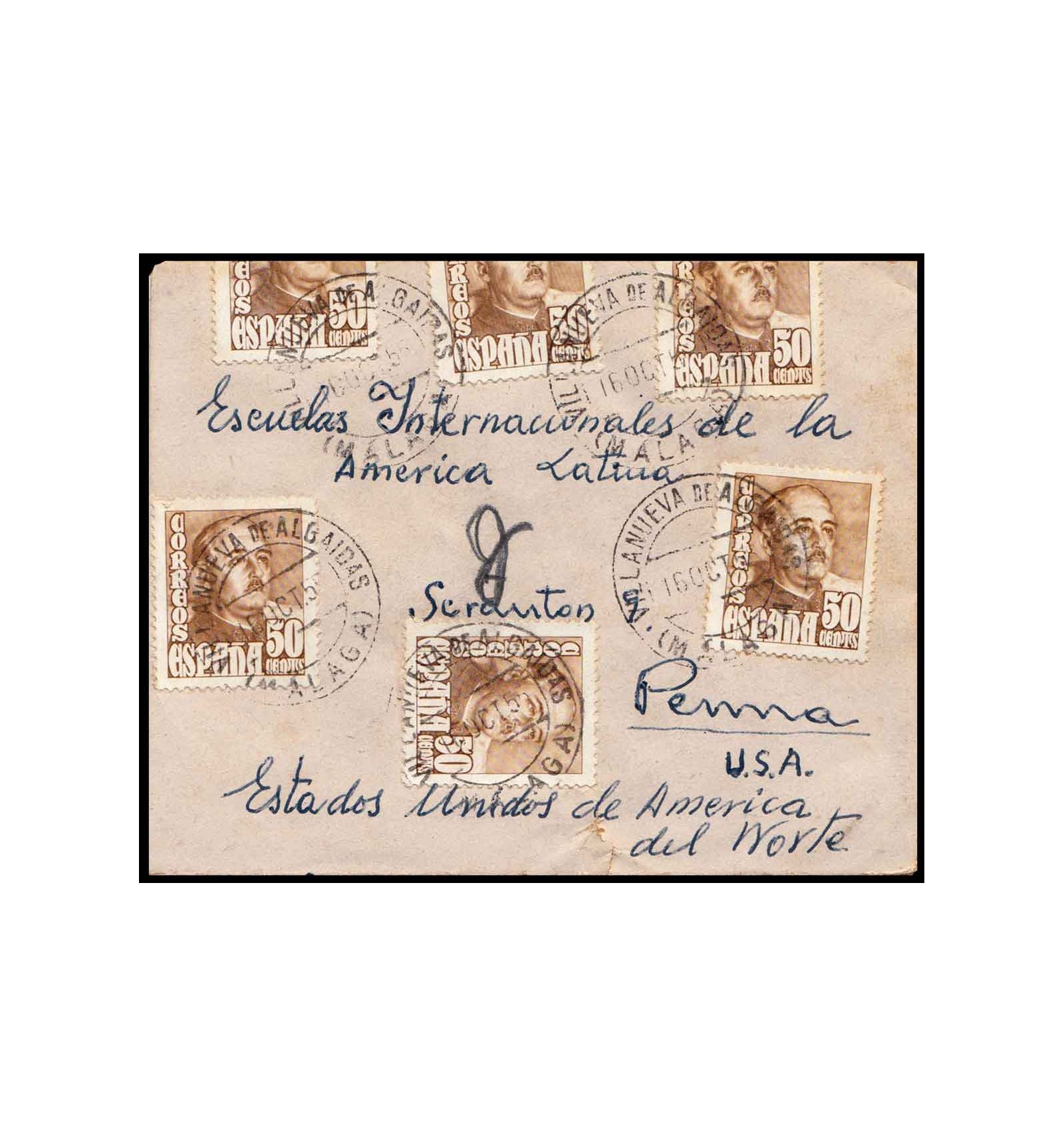 Sobre de Villanueva de Algaidas (Málaga) a EE.UU del 16 de octubre de 1955.