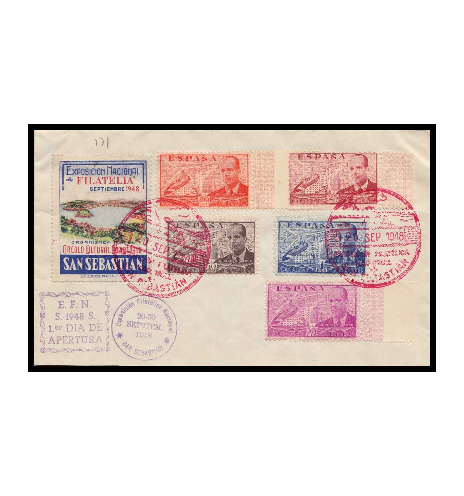 Sobre con matasellos conmemorativo de la Exposición Filatélica Nacional del 20-30 de septiembre de 1948 celebrada en San Sebastián. En los sellos de Juan de la Cierva se imprimieron en caracteres pequeños a modo de fondo EXPOSICION NACIONAL DE FILATELIA SAN SEBASTIAN 1948. El sobre corresponde al primer día de apertura d ella exposición. Rara pieza conmemorativa.
