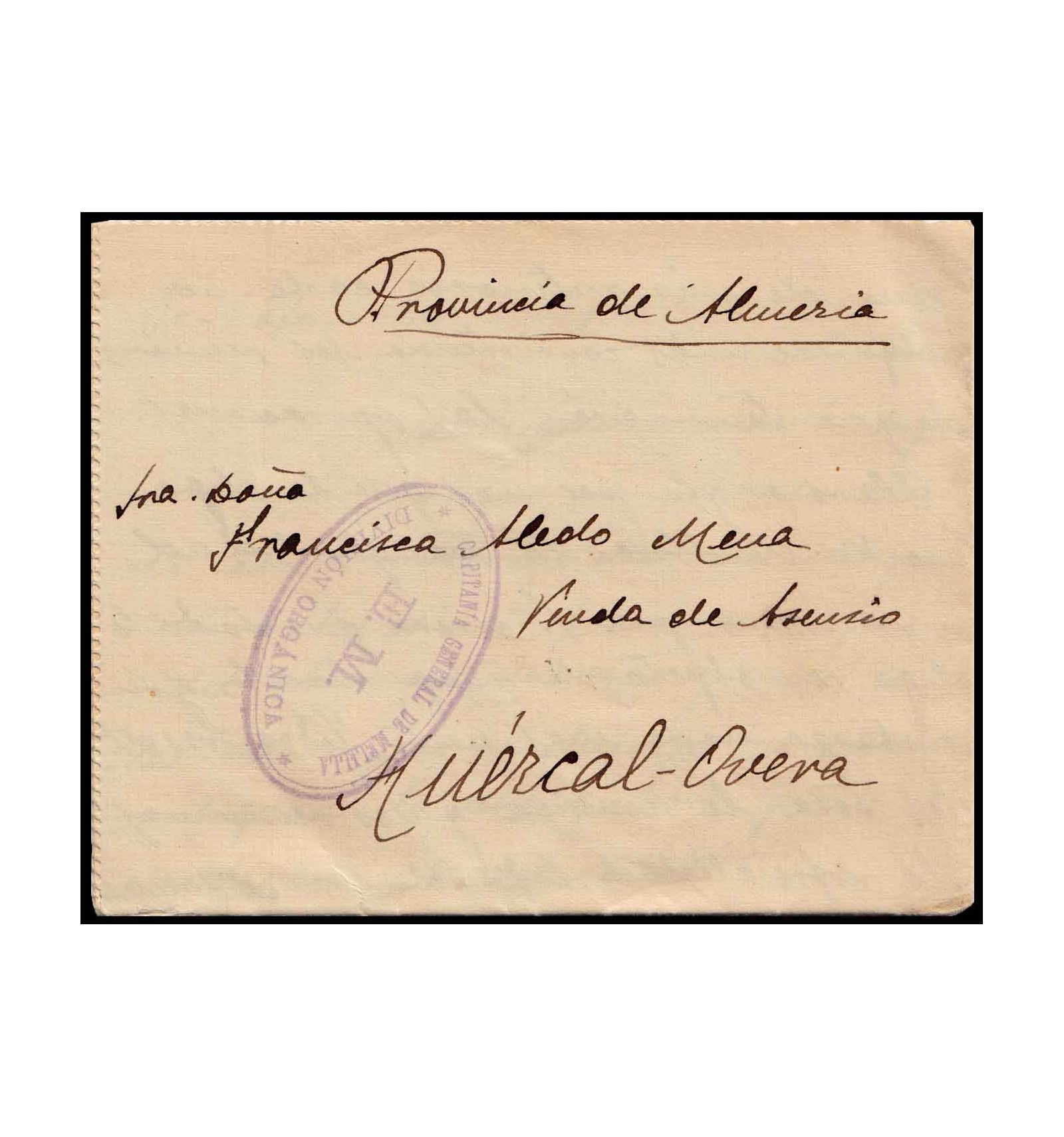 Carta de Iz-Hafen (Melilla) a Huercal Over (Almería) del 22 de octubre de 1911. Franquicia de la Capitanía General de Melilla E.M. División Orgánica. En reverso llegada a Huercal Overa (Almería).