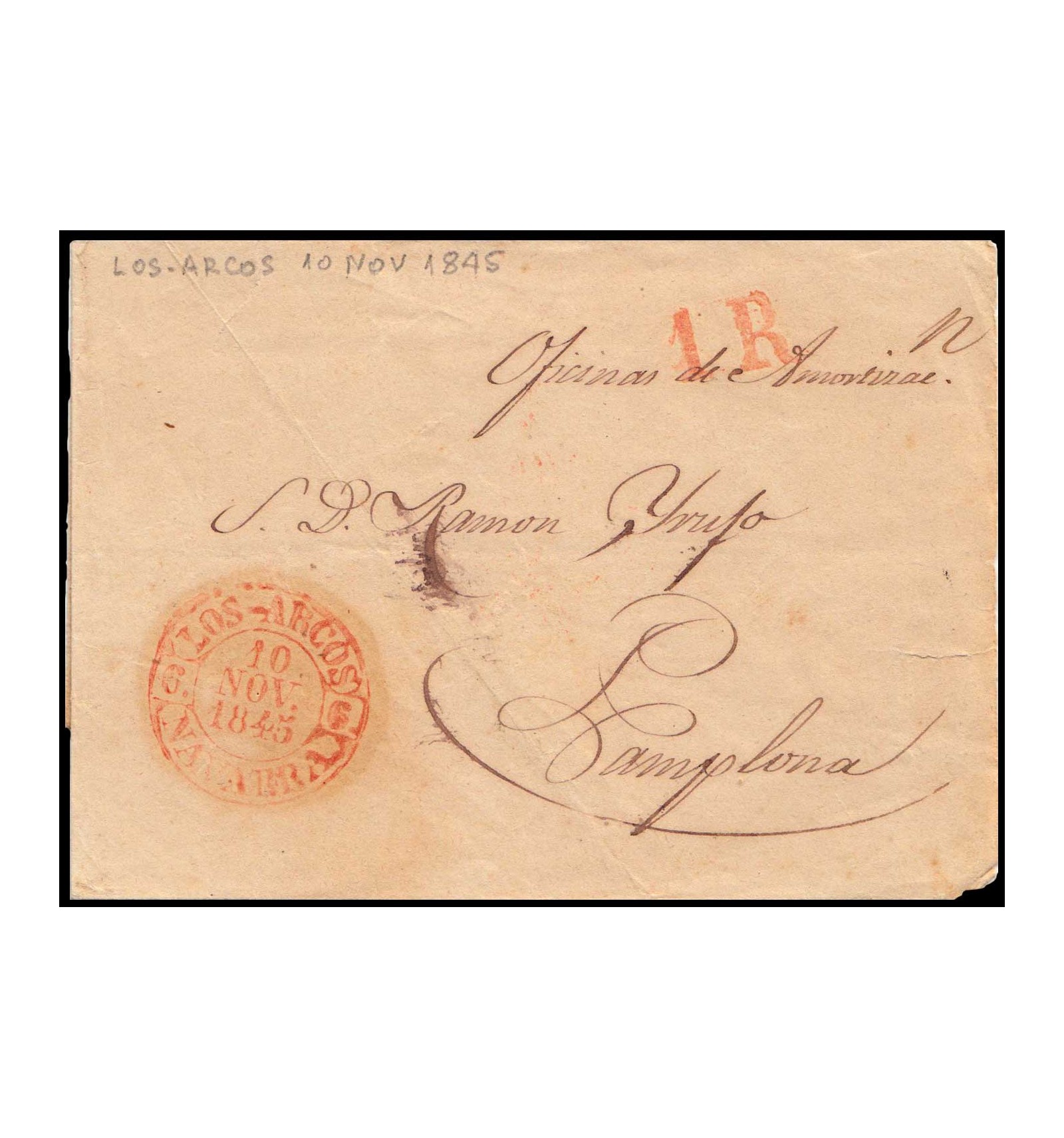 Envuelta de Los Arcos (Navarra) a Pamplona del 10 de noviembre de 1845. Baeza rojo. En reverso baeza rojo de llegada a Pamplona. Porteo 1R rojo.