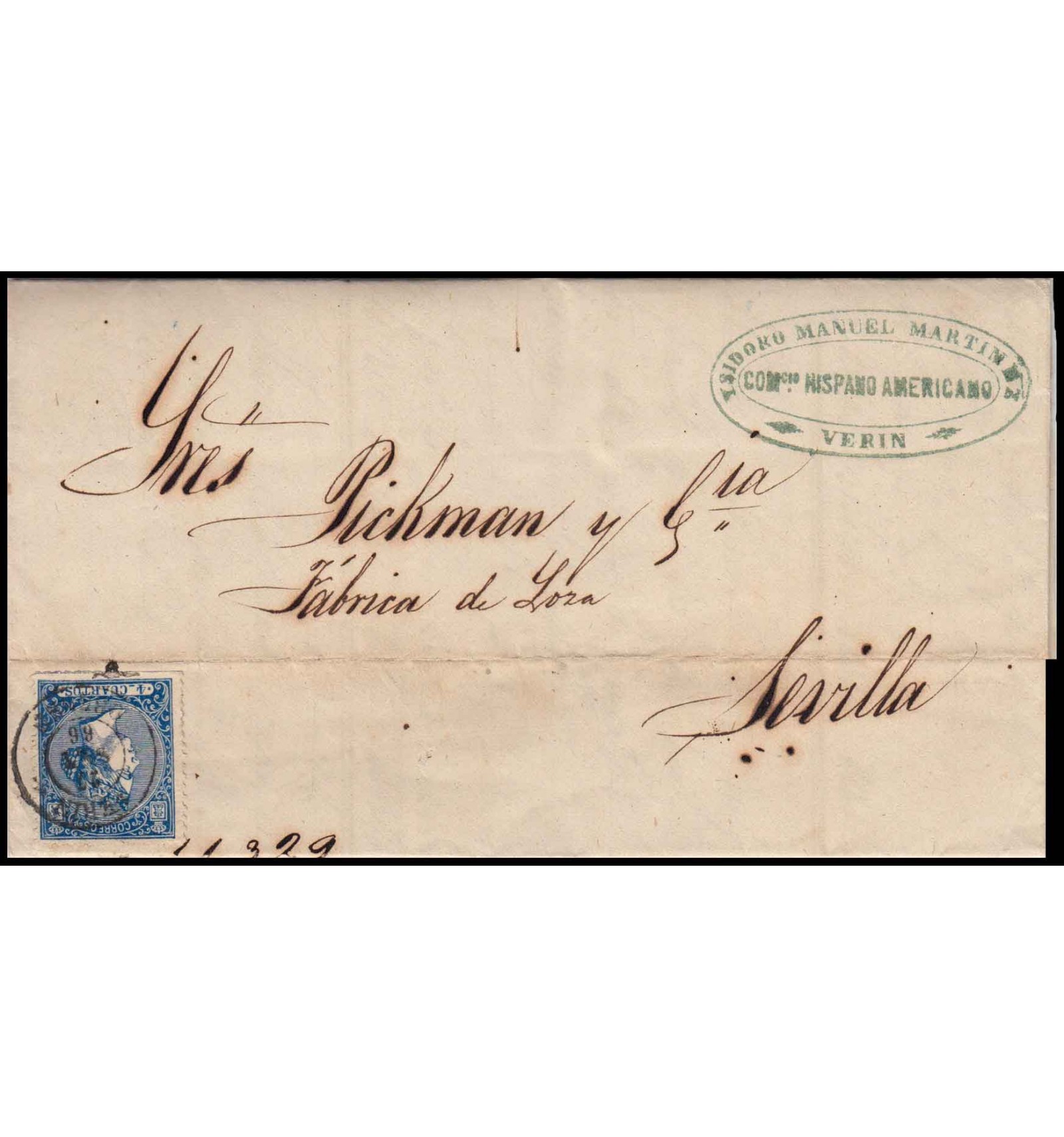 Carta de Verín (Orense, Galicia) a Sevilla del 27 de septiembre de 1866. En reverso estimación regular de llegada a Sevilla.