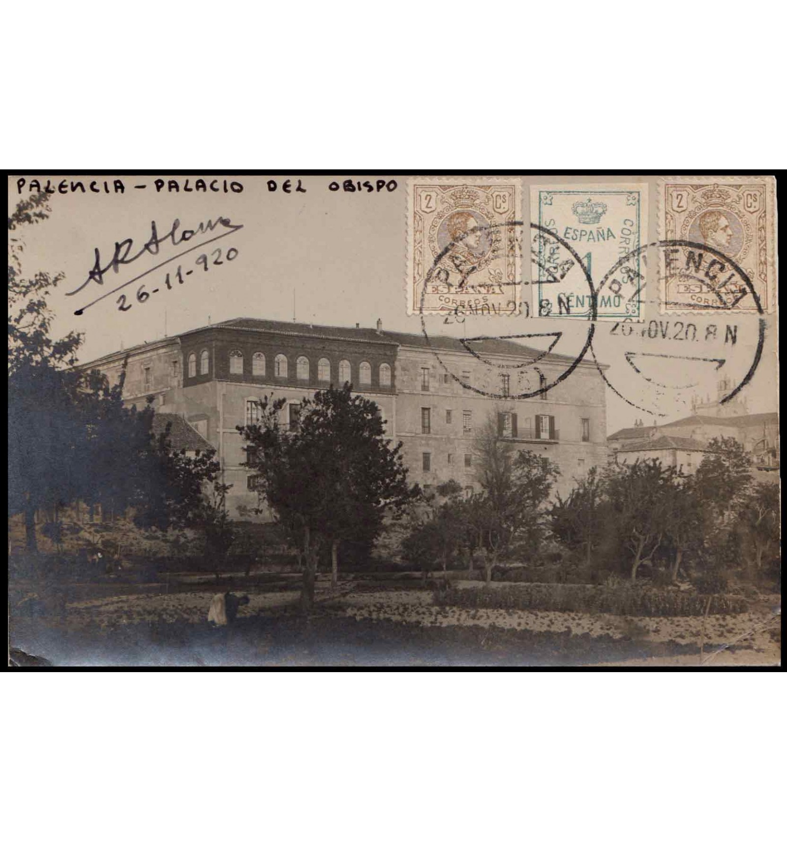 Tarjeta postal del Palacio del Obispo de Palencia a Luxemburgo del 26 de noviembre de 1920.