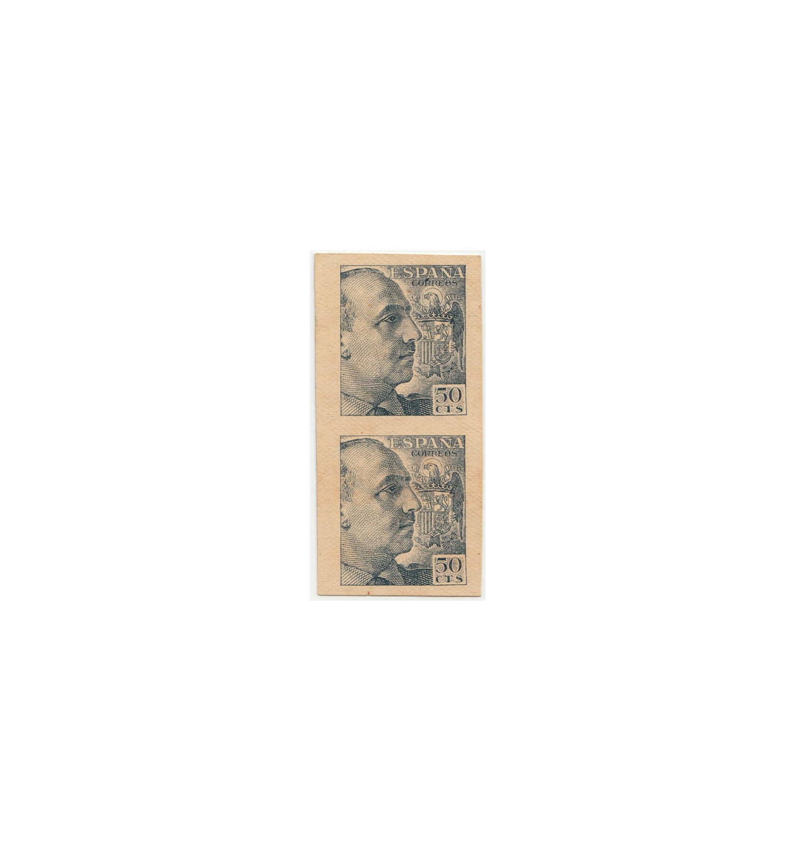 Pareja de un ensayo de plancha del 50 cts azul gris con papel grueso amarillento y con filigrana (similar, pero en diferente papel, a Gálvez 3649). Maquilla de autenticidad Roig.