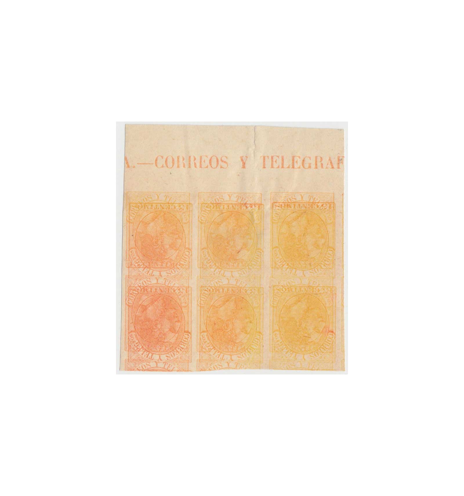 Maculatura en bloque de seis (con parte de una cabecera) con doble impresión (normal + invertida). Se destaca del cambio progresivo del color de naranja a amarillo, lo que implica que integra dos referencias de Gálvez.