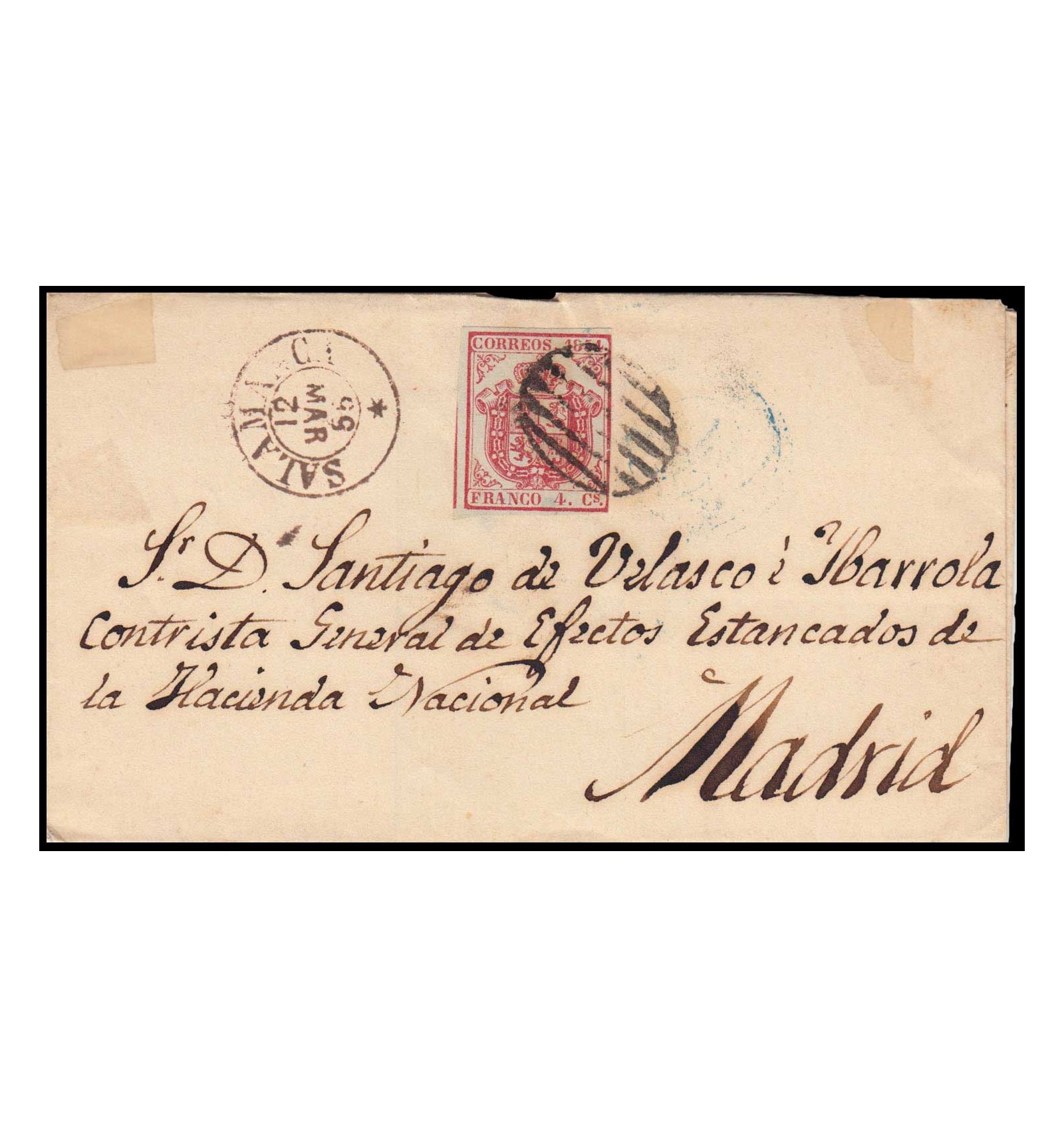 Carta de Salamanca a Madrid del 12 de marzo de 1855. Mes del fechador ladrillo de Salamanca invertido. Anulación del sello con parrilla negra.