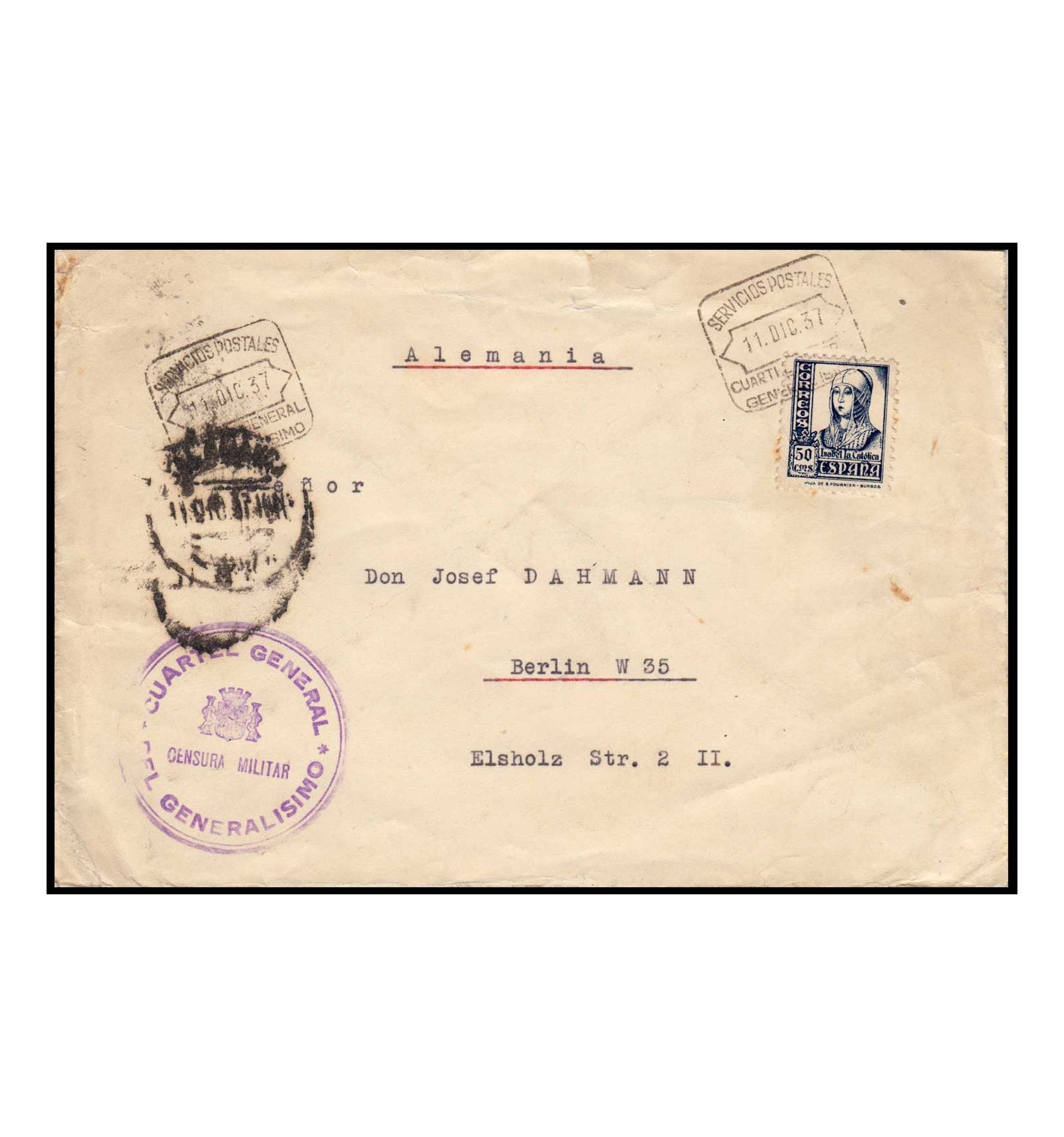Sobre de Salamanca nacido en el cuartel General del Generalísimo a Alemania del 11 de diciembre de 1937. Censura militar violeta del cuartel