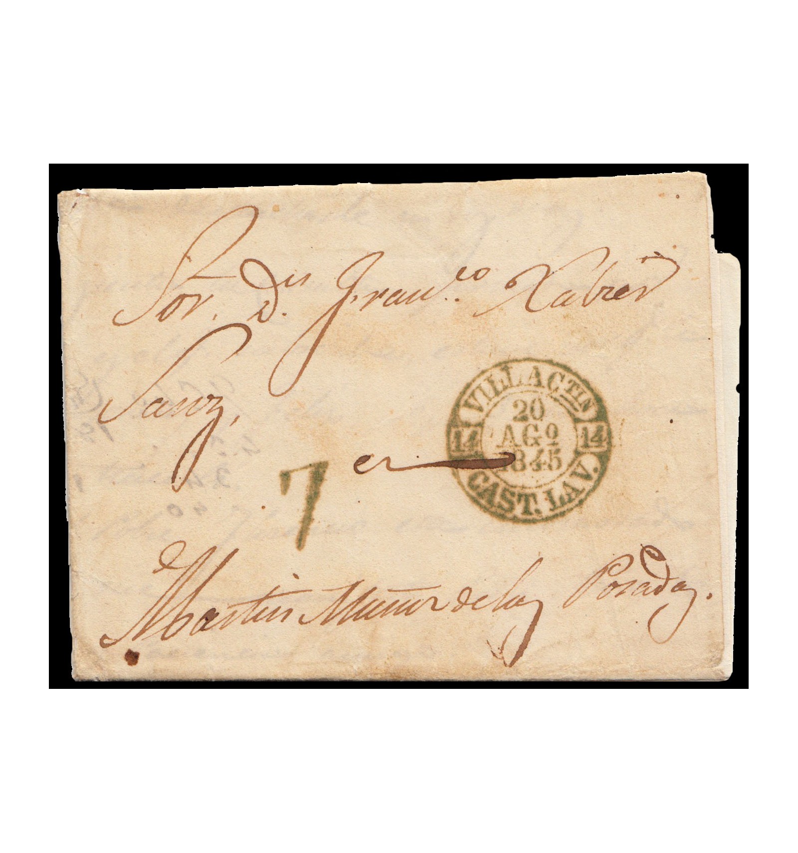 Carta Villacastín (Segovia) a Martín Muñoz de la Posada fechada el 20 de agosto de 1845. Matasello fechador baeza verde de Villascastín. Porteo 7 en verde