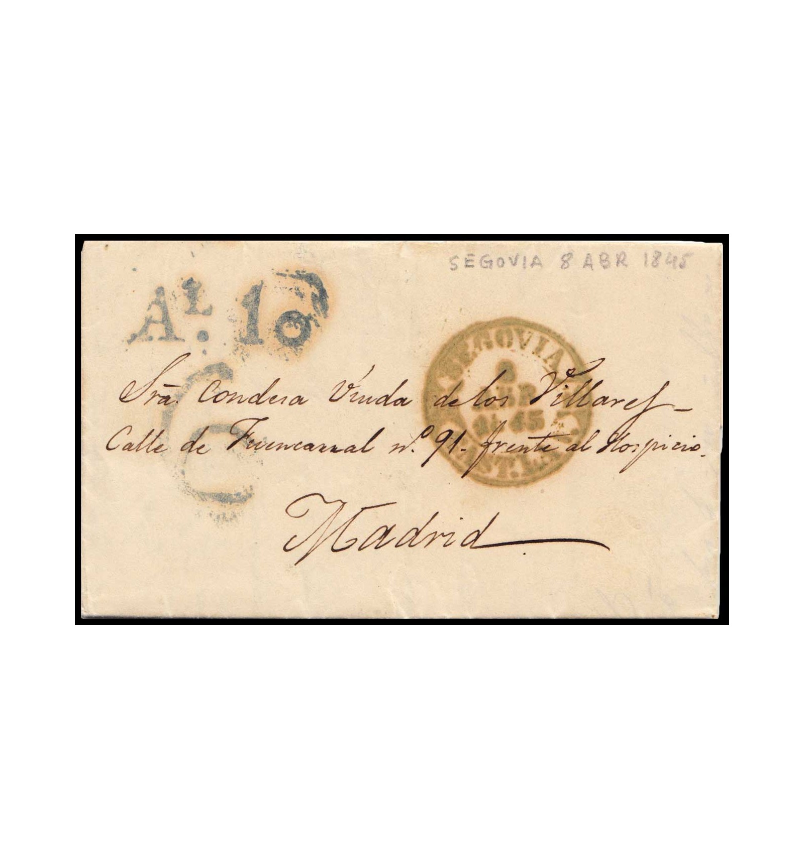 Carta de Segovia a Madrid del 8 de abril de 1845. Baeza verde de Segovia. Porteo/fechador de llegada en azul con porteo 6.