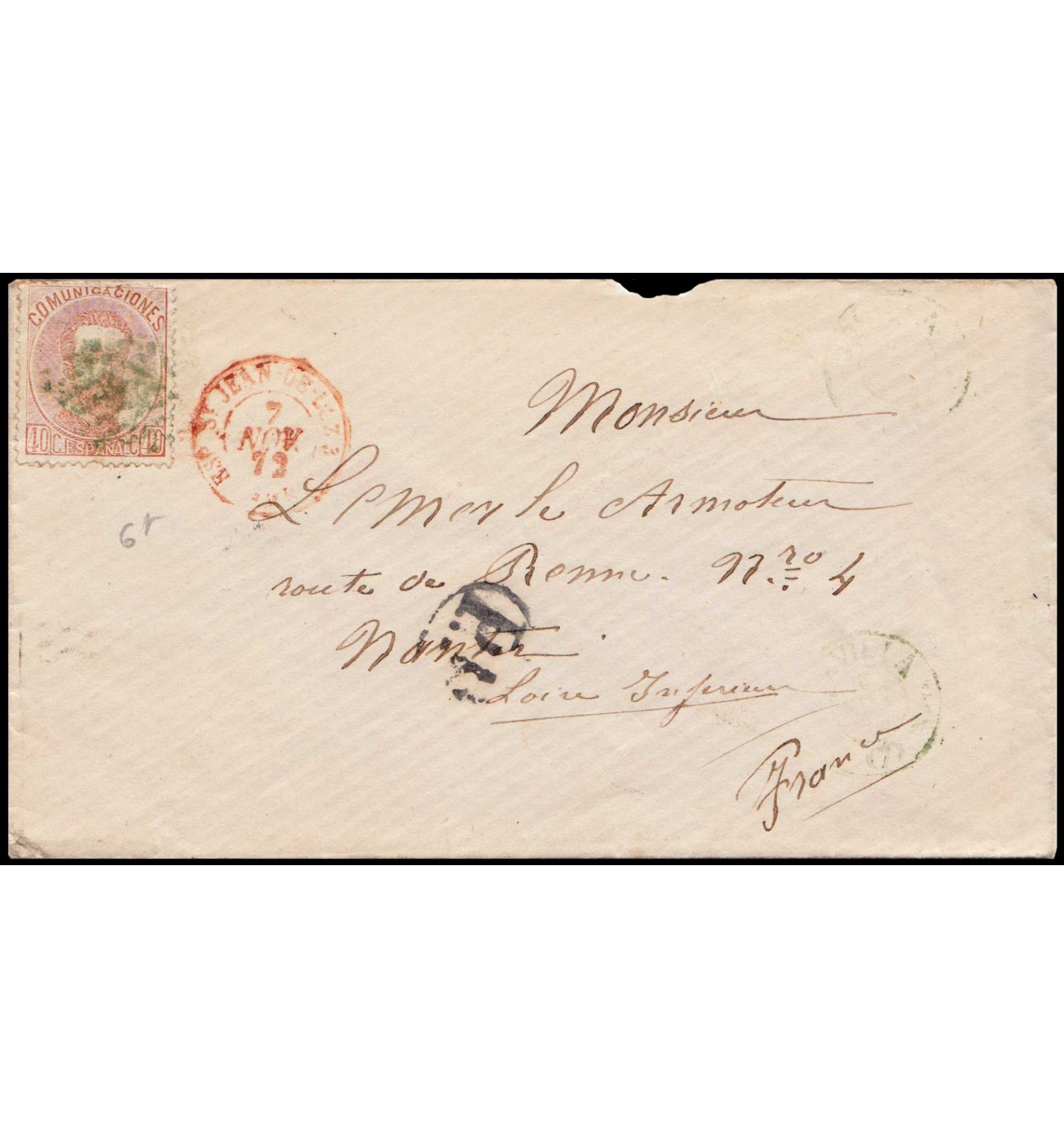 1872. Sobre de Sevilla a Nantes (Francia) de noviembre 1872. Rombo puntos en verde-azulado o azul-verdoso, marca PD en negro, tránsito San Juan de Luz en rojo. En reverso parcialmente completo tránsito por Madrid del 6 de noviembre.