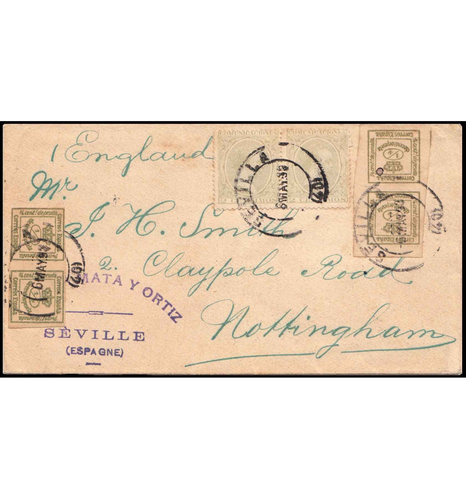 Sobre de de Sevilla a Nottingham (Gran Bretaña) del 6 de mayo de 1893. Tarifa correspondiente a un porte de impresos.