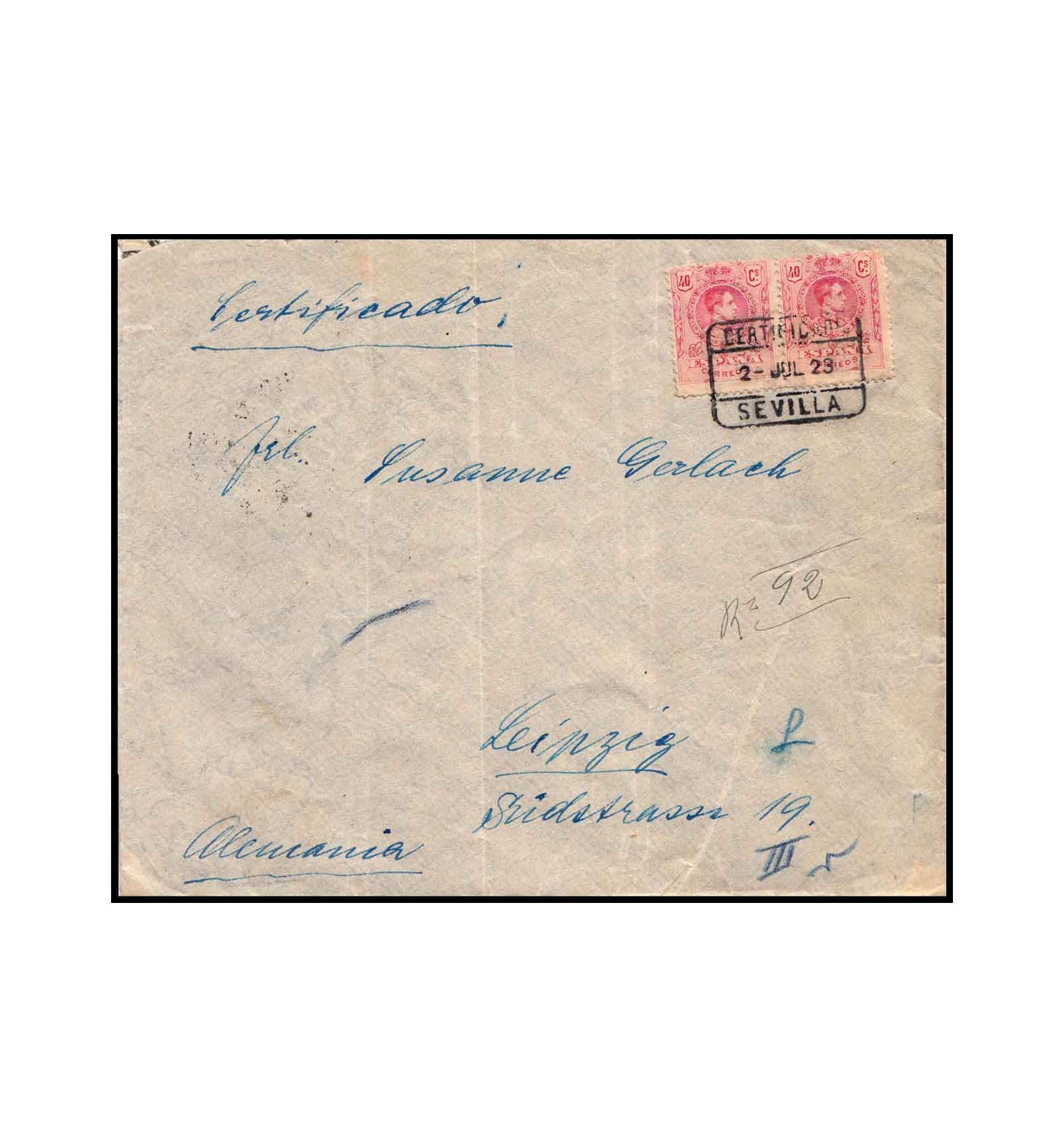 Sobre certificado de Sevilla a Alemania del 2 de julio de 1923, En reverso tránsito certificado de Madrid y llegada a Leipzig.