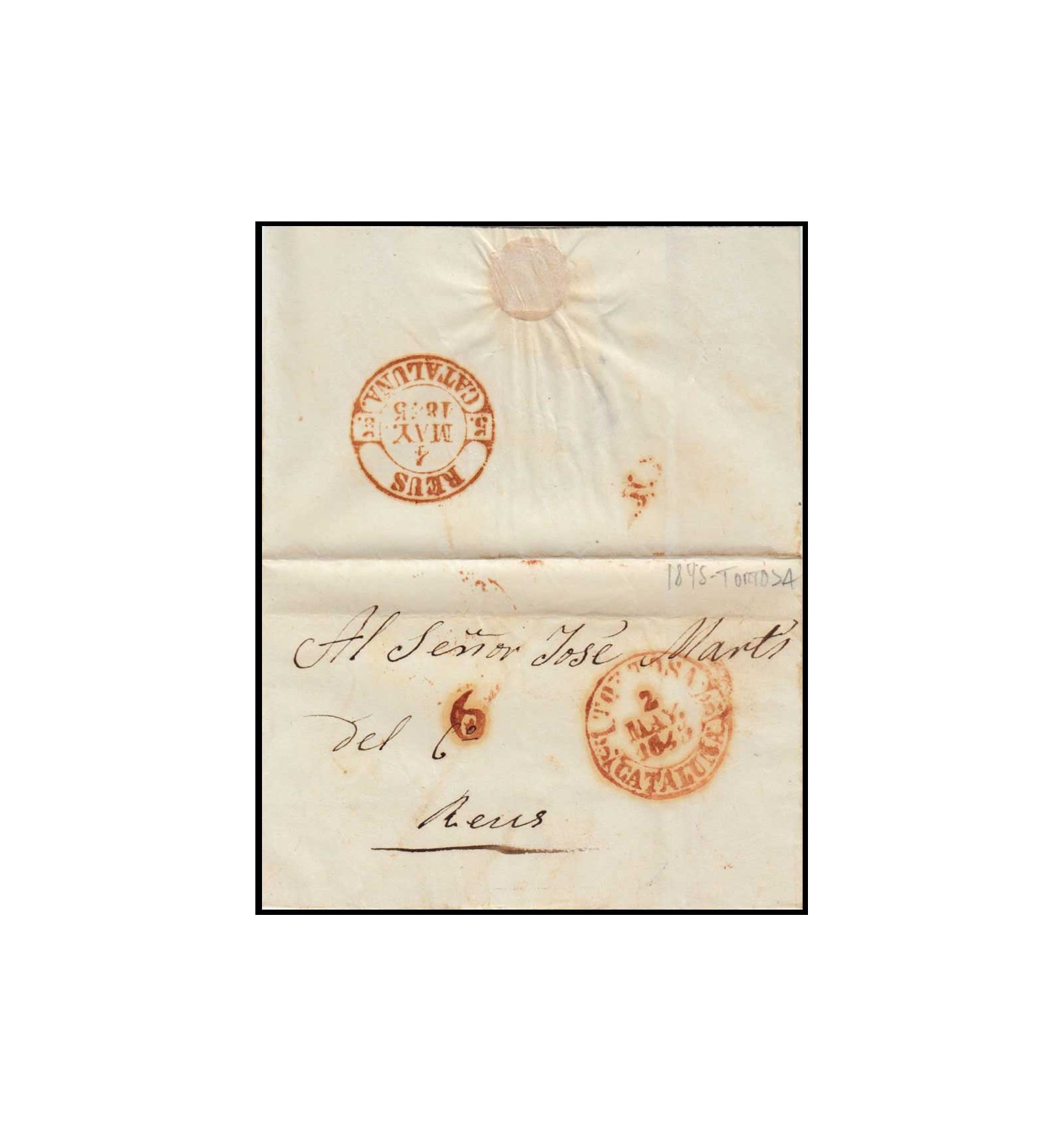 Envuelta de Tortosa (Tarragona) a Reus del 2 de mayo de 1845. Porteo 6 en rojo y fechador baeza. En reverso baeza de llegada a Reus del día 4 de mayo.