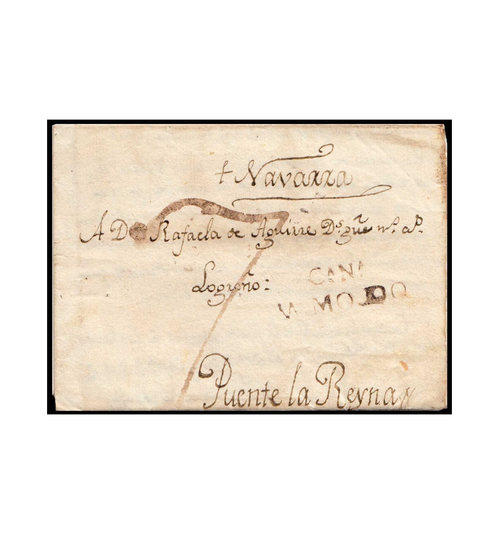 Carta de Mentridas (Toledo) a Puente la Reyna (Navarra) del 18 de abril de 1820. Debido a que era una pequeña población, dependía postalmente de Valmojado, donde tamponan la marca de salida. Porteo manuscrito 7.