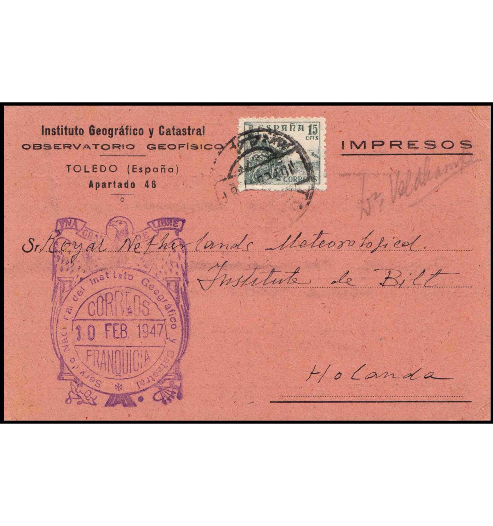 Tarjeta postal del Instituto Geográfico y Catastral, observatorio geofísico de Toledo a Holanda del 10 de febrero de 1947. Se impuso la franquicia, pero como se destinó al extranjero la franquicia no cubre y se impuso la tarifa de tarjeta postal al extranjero (15 cts).