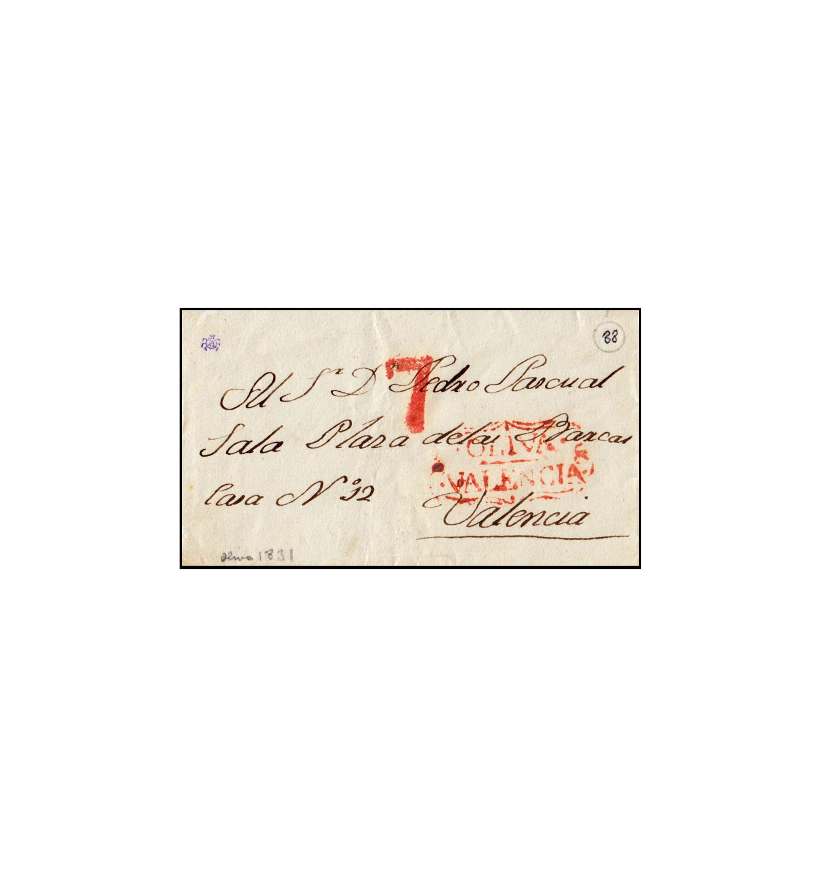 Frontal de Oliva (Valencia) a Valencia con marca en color rojo/ladrillo. Porteo 7 en rojo.