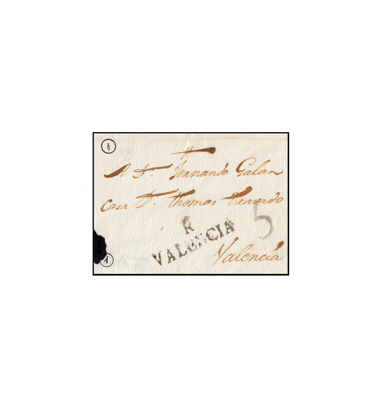 Frontal de Requena (Valencia) a Valencia. Porteo 5 en negro. Marca prefilatélica en negro.