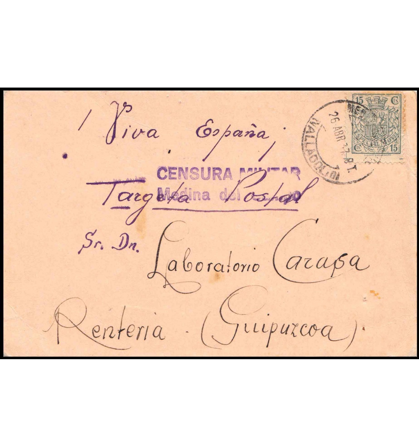 Tarjeta postal de cartulina de Medina del Campo (Valladolid) a Rentería (Guipúzcoa) del 26 de abril de 1937. Sello fiscal de especial móvil usado postalmente. Censura militar de Medina del Campo.