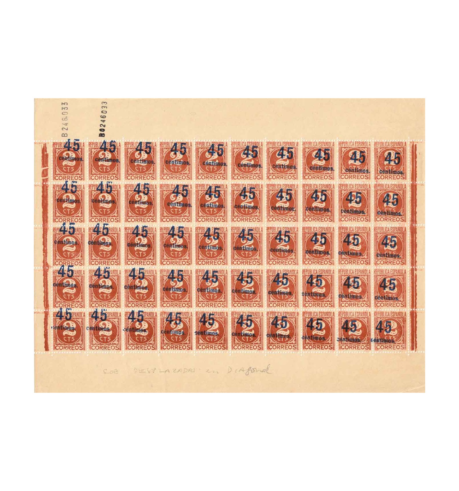 ** Pliego de 50 sellos con desplazamiento de la sobrecarga que se dispone en diagonal.