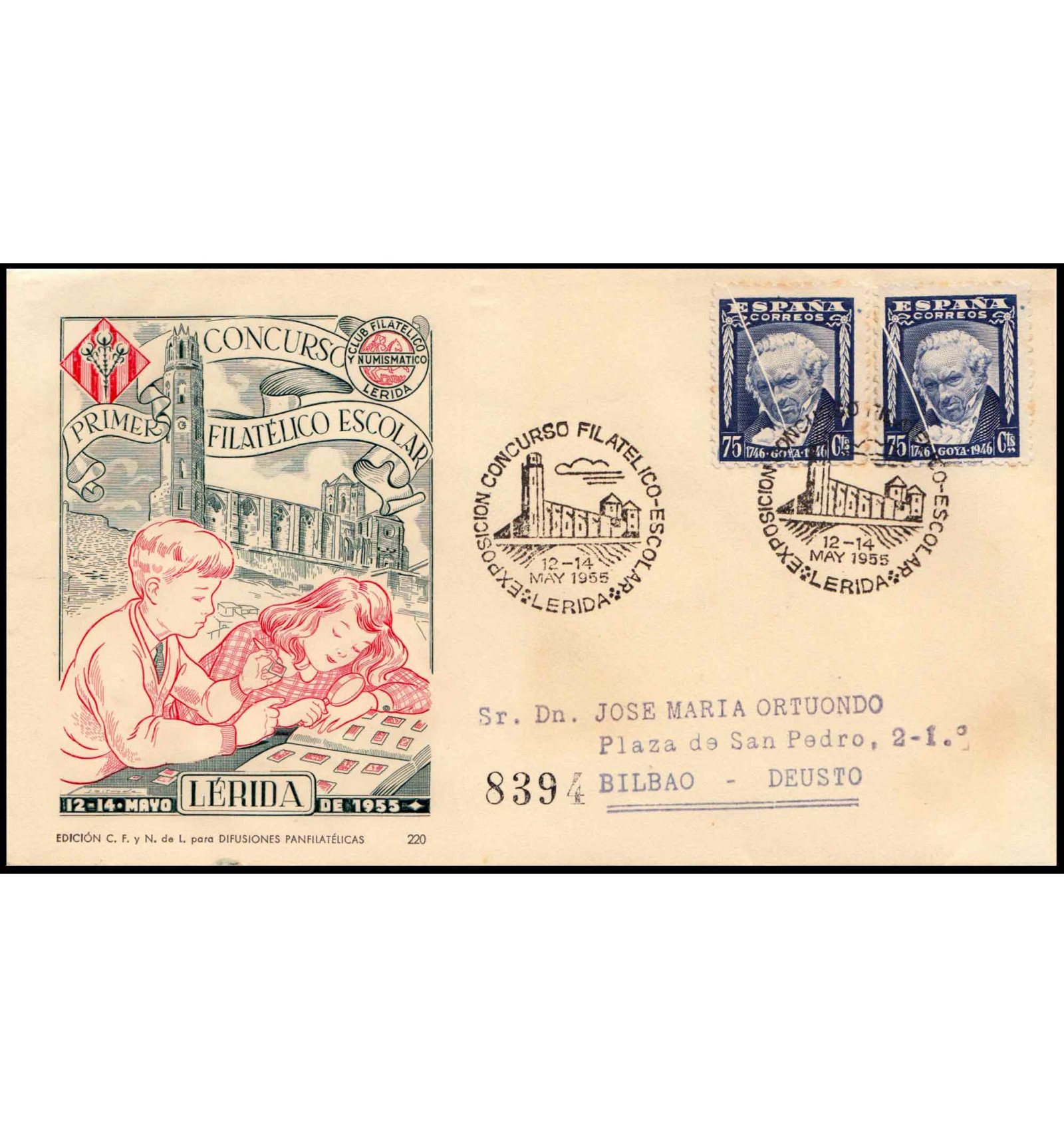 Sobre realmente circulado del Primer Concurso Filatélico Escolar y exposición de Lérida de mayo de 1955 con matasello conmemorativo. Dos sellos de Goya ambos con fuelle de papel vertical (se cataloga en Edifil el fuelle horizontal). En reverso matasello certificado de cartería de Bilbao del 13 de mayo de 1955.