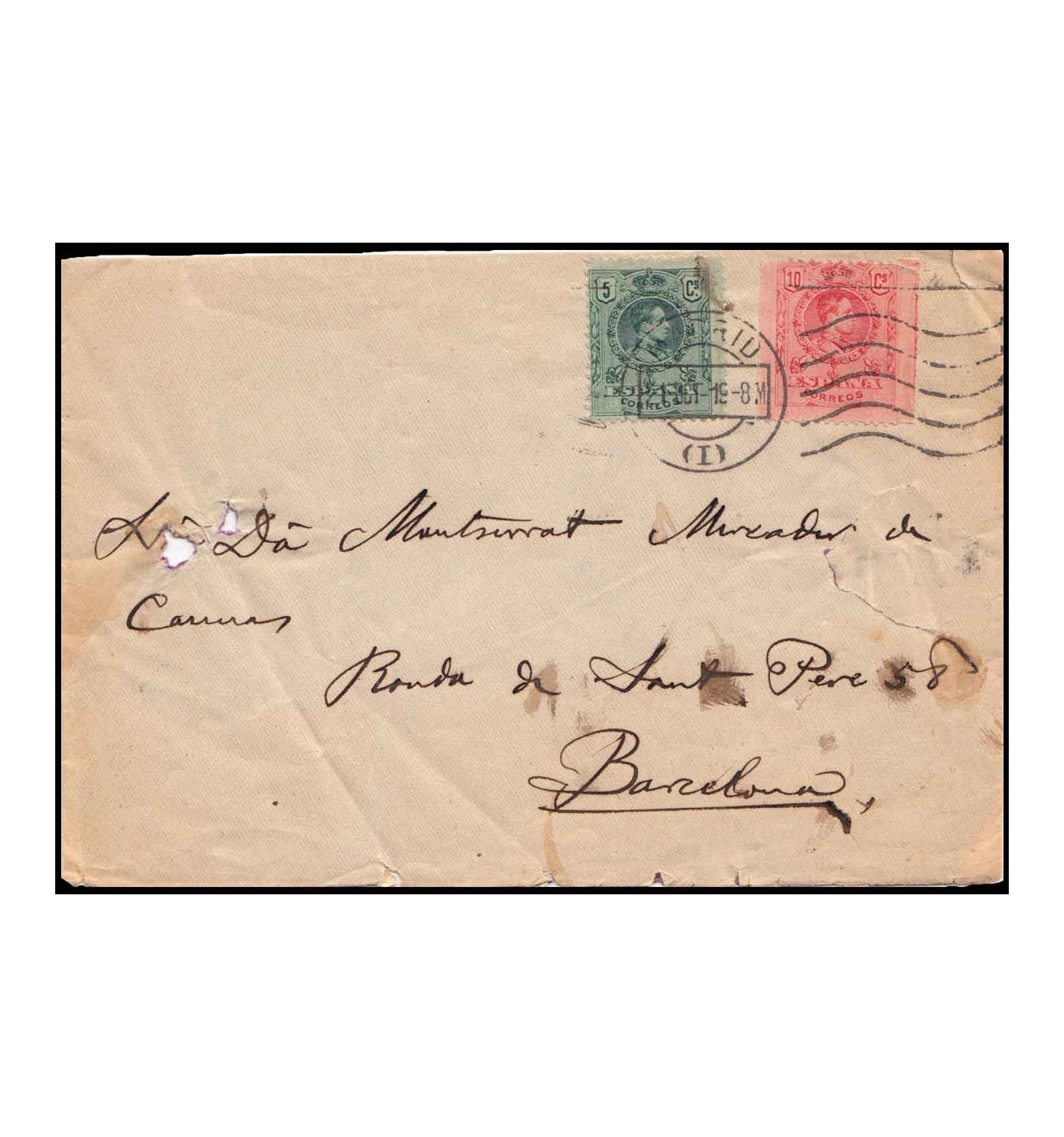 Sobre de Madrid a Barcelona del 21 de octubre de 1919. En reverso llegada a Barcelona. Sello de 10 cm en apariencia sin dentar en lados izquierdo y derecho, pero en uno de los lados se observa posiblemente unos pequeño"restos" de dentado, lo que parece indicar un sello con un gran salto de peine.