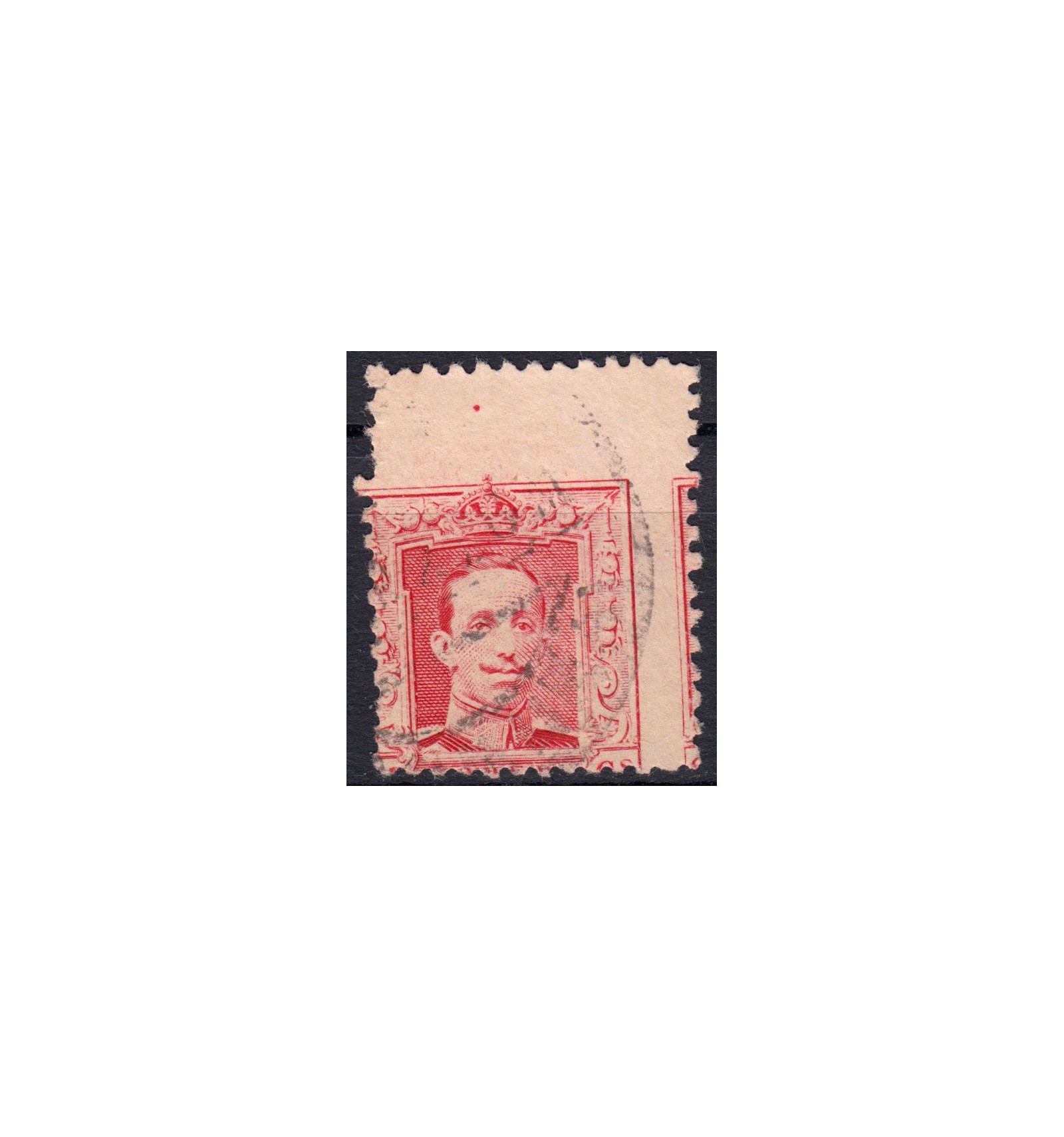 Sello usado de Vaquer 25 cts con dentado muy desplazado, hasta el punto de no reconocer el cartucho inferior de la leyenda de España y el valor del sello.