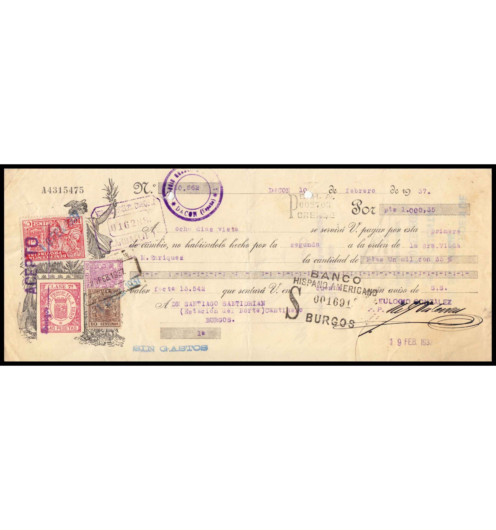 Letra de cambio con especial móvil y sello benéfico provincial de Orense de beneficencia. Letra confirmada por Banco Hispano Americano.