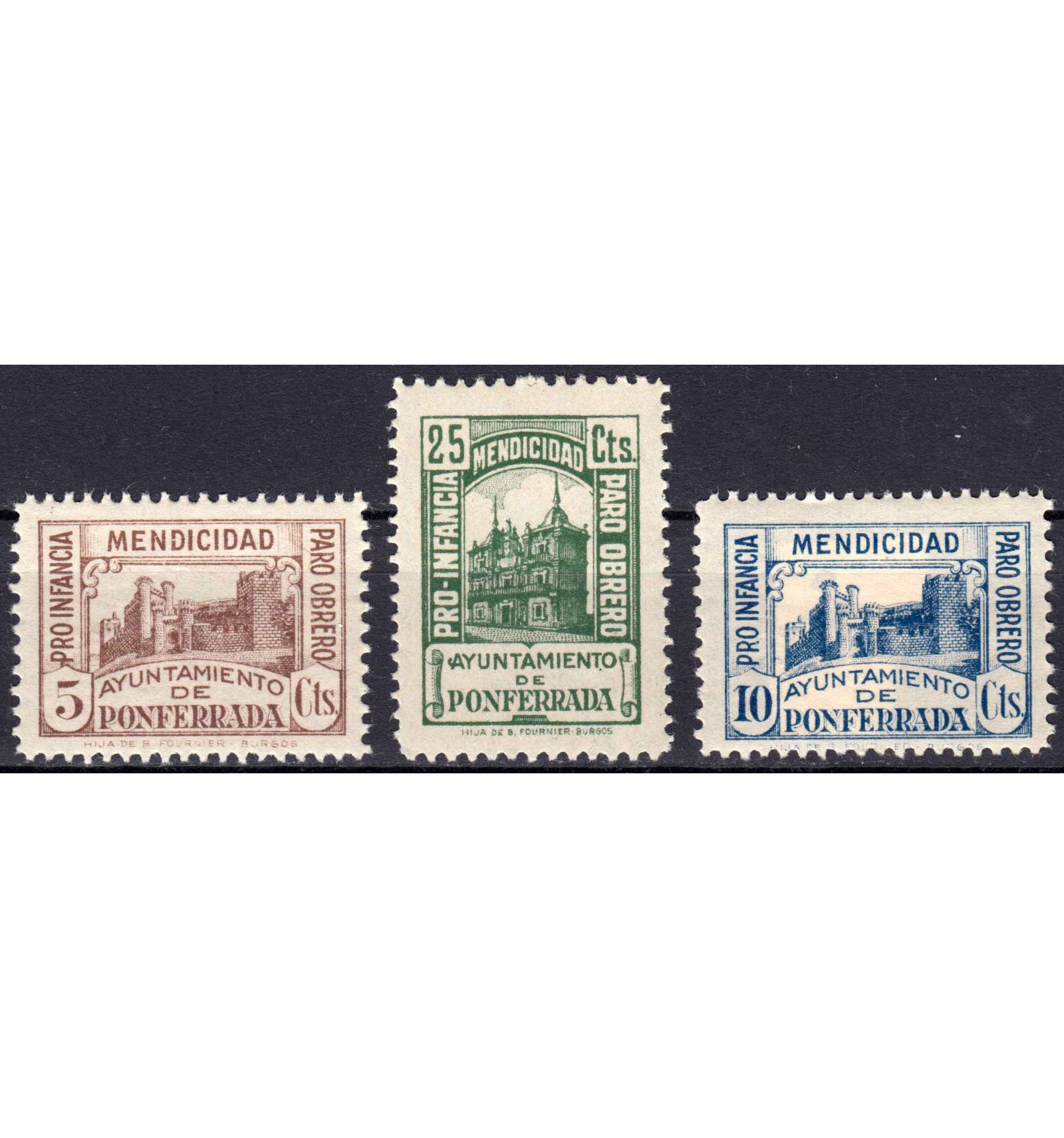 Tres viñetas del Ayuntamiento de Ponderada (León) del Pro-infancia, paro obrero y mendicidad. Sin charnela (**) y de lujo.